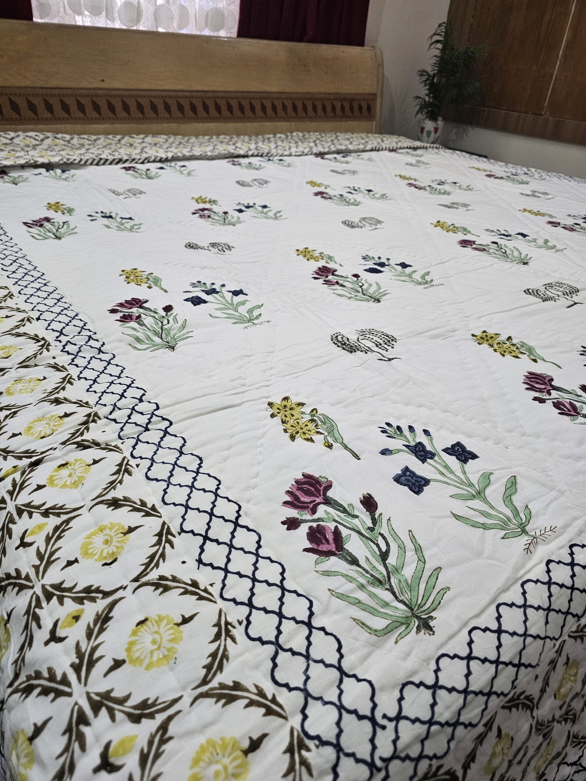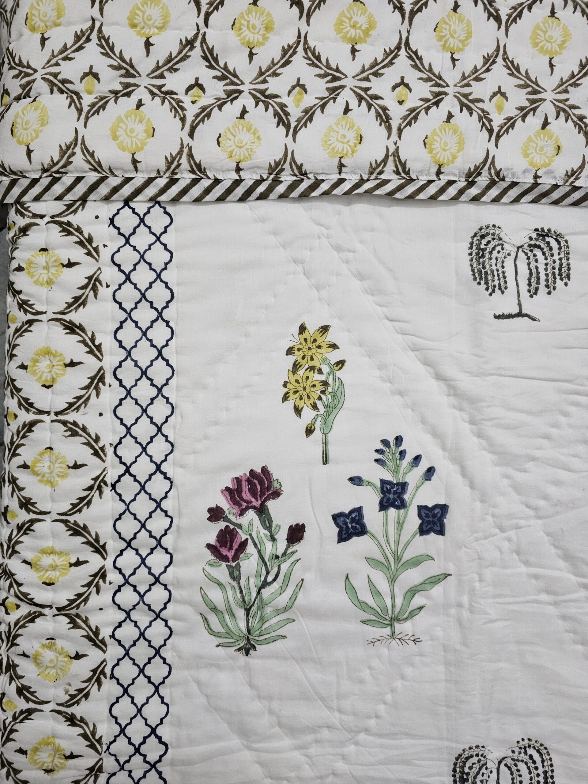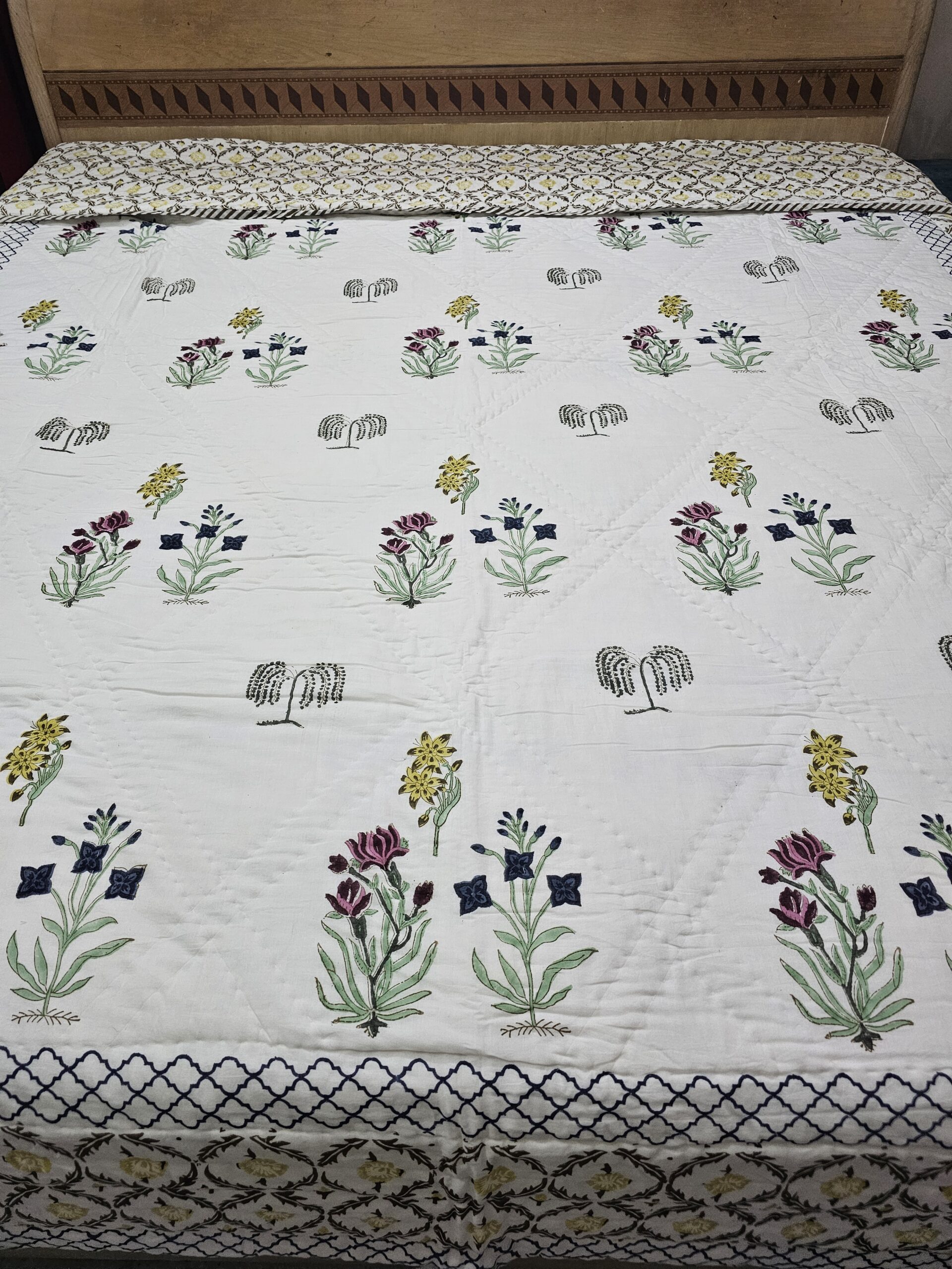 Reversible Handblock Double AC Quilt – Yellow Flower Border